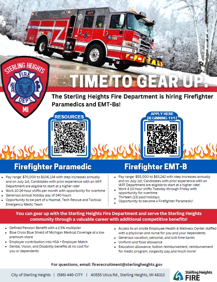 Sterling Heights, MI – Firefighter EMT-B – Deadline December 8, 2025